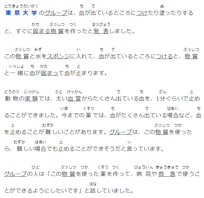 東京大學(xué)のグループは、血が出ているところにつけたり塗ったりすると、すぐに固まる物質(zhì)を作ったと発表しました。