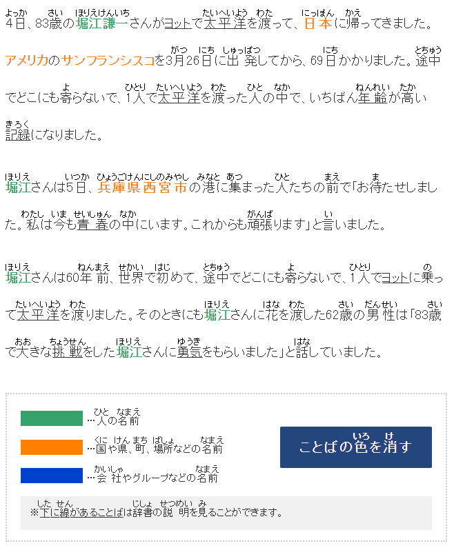 4日、83歳の堀江謙一さんがヨットで太平洋を渡って、日本に帰ってきました。アメリカのサンフランシスコを3月26日に出発してから、69日かかりました。途中でどこにも寄らないで、1人で太平洋を渡った人の中で、いちばん年齢が高い記録になりました。