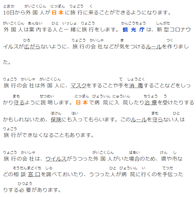 10日から外國人が日本に旅行に來ることができるようになります。外國人は案內する人と一緒に旅行をします。観光庁は、新型コロナウイルスが広がらないように、旅行の會社などが気をつけるルールを作りました。