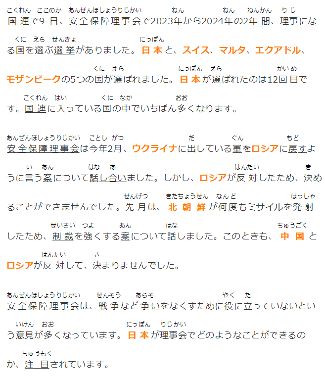 國連で9日、安全保障理事會で2023年から2024年の2年間、理事になる國を選ぶ選挙がありました。日本と、スイス、マルタ、エクアドル、モザンビークの5つの國が選ばれました。日本が選ばれたのは12回目です。國連に入っている國の中でいちばん多くなります。