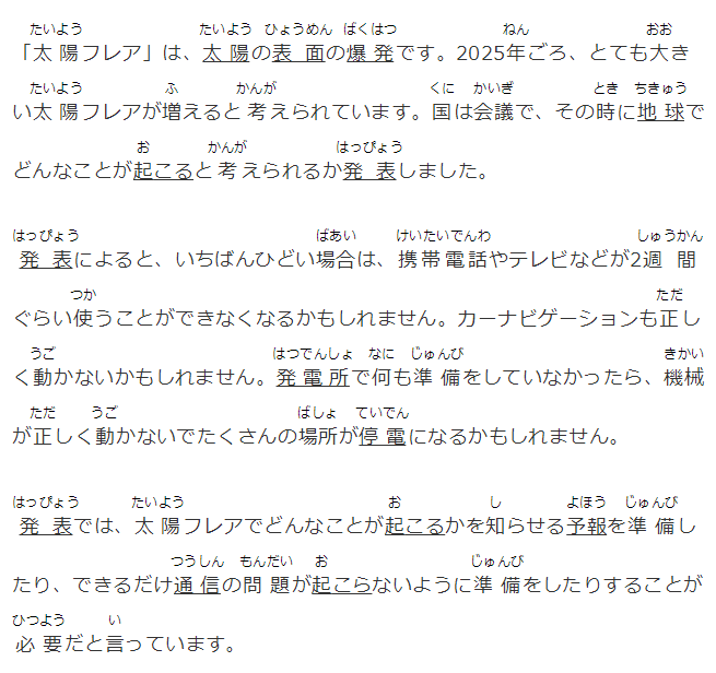 「太陽フレア」は、太陽の表面の爆発です。2025年ごろ、とても大きい太陽フレアが増えると考えられています。國は會議で、その時に地球でどんなことが起こると考えられるか発表しました。