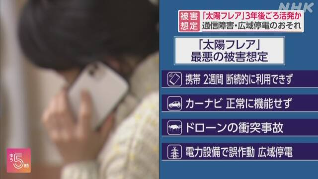 それによりますと、太陽フレアによって地球上の磁気が亂れることで、最悪、攜帯電話やテレビなどの放送が2週間、斷続的に利用できなくなったり視聴できなくなったりするおそれがあるということです。