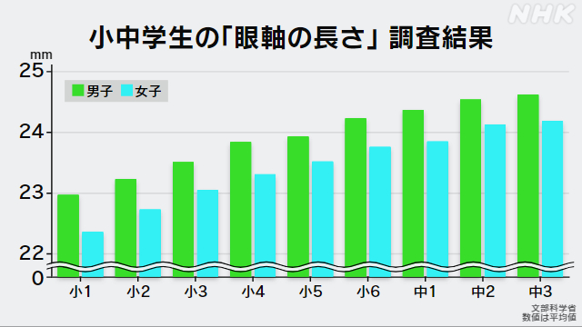 明るさや色、形などを感じる網膜までの眼軸が長いと、近視が進んでいることになります。眼軸の長さは、大人の平均で24mmぐらいです。小學校6年生は、平均で男子が24.22mmで、女子が23.75mmでした。大人と同じぐらいになっていました。中學校3年生は、男子が24.61mmで、女子が24.18mmで、もっと長くなっていました。