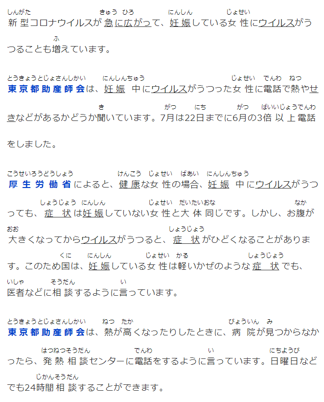 東京都助産師會は、妊娠中にウイルスがうつった女性に電話で熱やせきなどがあるかどうか聞いています。7月は22日までに6月の3倍以上電話をしました。