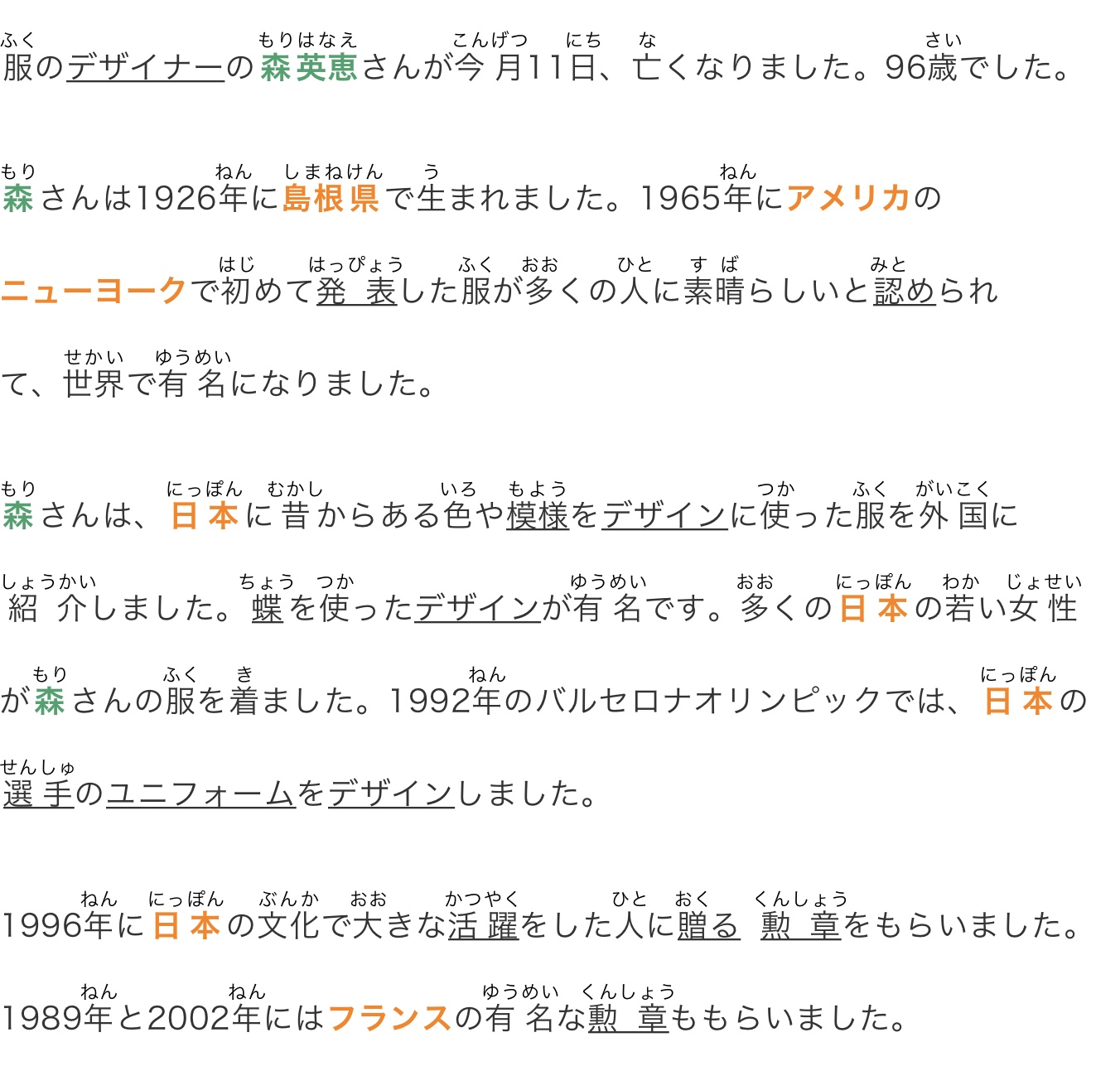 森さんは1926年に島根県で生まれました。1965年にアメリカのニューヨークで初めて発表した服が多くの人に素晴らしいと認められて、世界で有名になりました。