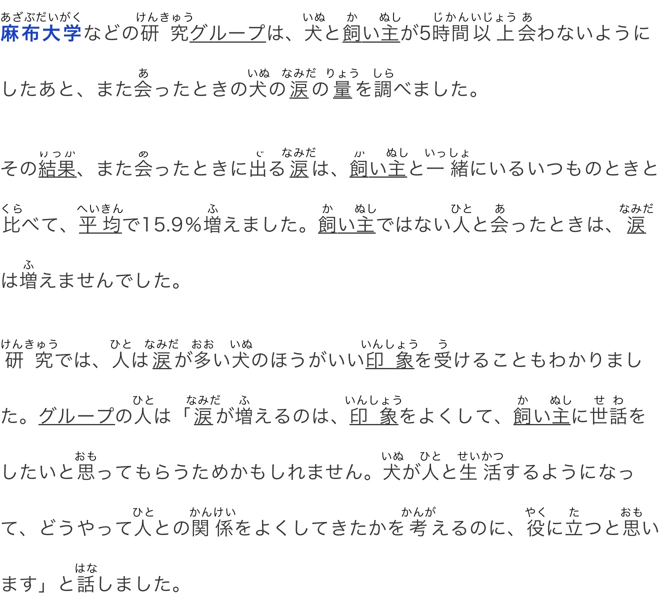 その結(jié)果、また會(huì)ったときに出る涙は、飼い主と一緒にいるいつものときと比べて、平均で15.9%増えました。飼い主ではない人と會(huì)ったときは、涙は増えませんでした。