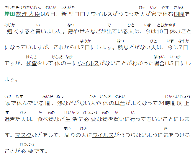 岸田総理大臣は6日、新型コロナウイルスがうつった人が家で休む期間を短くすると言いました。熱やせきなどが出ている人は、今は10日休むことになっていますが、これからは7日にします。熱などがない人は、今は7日ですが、検査をして體の中にウイルスがないことがわかった場合は5日にします。