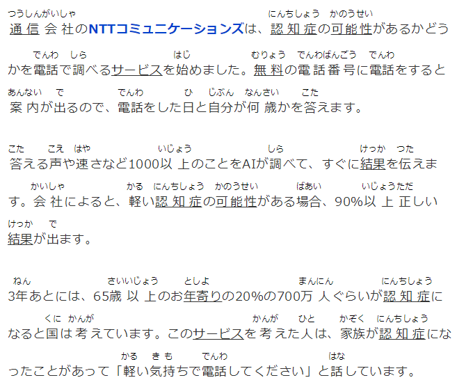 21日は認知癥への正しい理解と支援を呼びかける世界アルツハイマーデーです。日本でも認知癥の早期発見と治療が課題となるなか、大手通信會社が、AI=人工知能を活用し、認知癥の疑いがあるかどうかを、電話で測定するサービスを無料で始めました。
