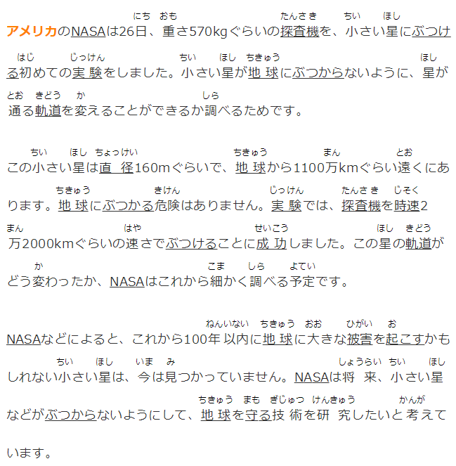 アメリカのNASAは26日、重さ570kgぐらいの探査機を、小さい星にぶつける初めての実験をしました。小さい星が地球にぶつからないように、星が通る軌道を変えることができるか調(diào)べるためです。