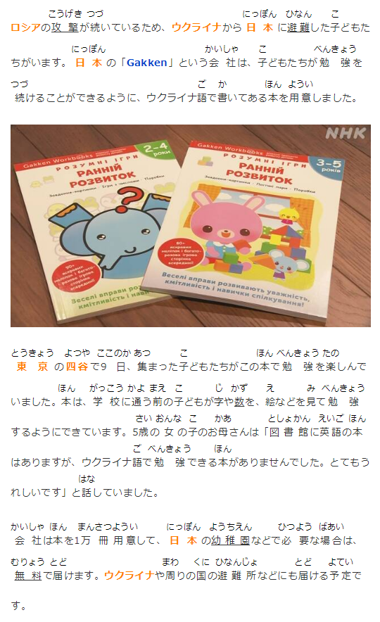 ロシアの攻撃が続いているため、ウクライナから日本に避難した子どもたちがいます。日本の「Gakken」という會社は、子どもたちが勉強を続けることができるように、ウクライナ語で書いてある本を用意しました。