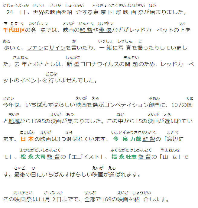 10月24日、世界の映畫を紹介する東京國際映畫祭が始まりました。千代田區(qū)の會場では、映畫の監(jiān)督や俳優(yōu)などがレッドカーペットの上を歩いて、ファンにサインを書いたり、一緒に寫真を撮ったりしていました。去年とおととしは、新型コロナウイルスの問題のため、レッドカーペットのイベントを行いませんでした。
