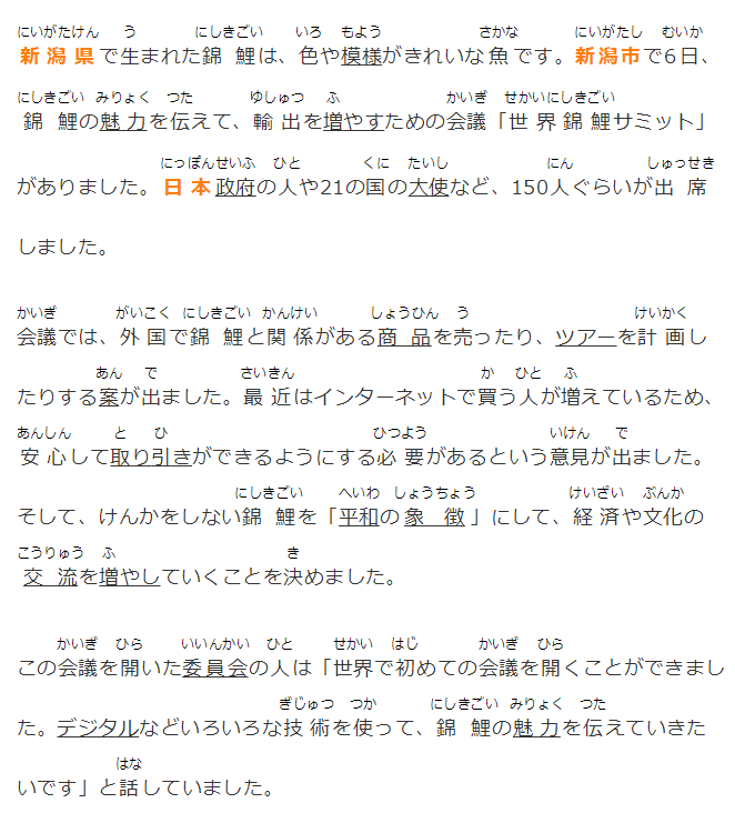 新潟県で生まれた錦鯉は、色や模様がきれいな魚です。新潟市で6日、錦鯉の魅力を伝えて、輸出を増やすための會議「世界錦鯉サミット」がありました。日本政府の人や21の國の大使など、150人ぐらいが出席しました。