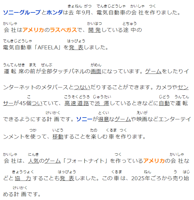 ソニーグループとホンダは去年9月、電気自動(dòng)車の會(huì)社を作りました。會(huì)社はアメリカのラスベガスで、開発している途中の電気自動(dòng)車「AFEELA」を発表しました。