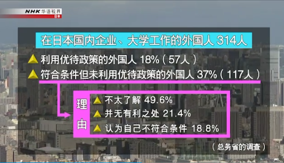 但對于該政策的實施情況,近日日本總務省對在日本國內的企業和大學工作的314名外國人進行了問詢調查。調查結果顯示,利用該政策并接受相關評定的外國人有57人,占比為18%;而符合相關條件卻未利用該政策的外國人卻有117人,占比高達37%。而對于沒有利用該政策的理由,49.6%的調查對象回答“對該政策不太了解”,21.4%的調查對象回答“覺得并無有利之處”。