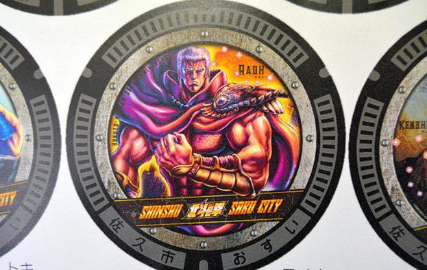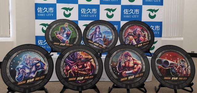 9月8日,佐久市政府便將位于佐久平站蓼科口一側(cè)人行道上的7處井蓋更換為《北斗神拳》的式樣。圖樣印刷在下雨也不易滑的樹(shù)脂上,并安裝在直徑約63厘米的鑄鐵制井蓋上,7名人氣角色分別被描繪上鮮艷的顏色。