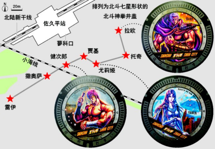 繼承暗殺拳法“北斗神拳”的健次郎胸口有著北斗七星形狀的傷痕,這也是故事重要的關(guān)鍵所在。因此在井蓋的配置方面,從上空看去,地面上呈現(xiàn)出長(zhǎng)約300米的北斗七星形狀。