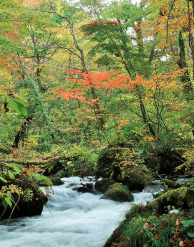 在八甲田山系的酸湯溫泉周邊,游客們還能觀賞到黃色的山毛櫸與紅色的花楸樹相映成趣的濃彩景色。