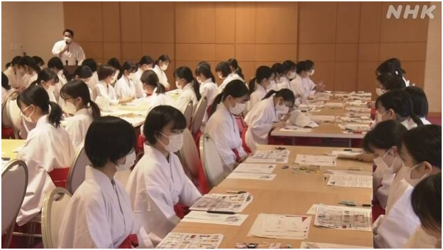 日本京都府京都市的北野天滿宮每逢新年都會有大批人前來參拜。日前,北野天滿宮啟動了對新年期間擔任巫女的大學生等臨時工的培訓工作。